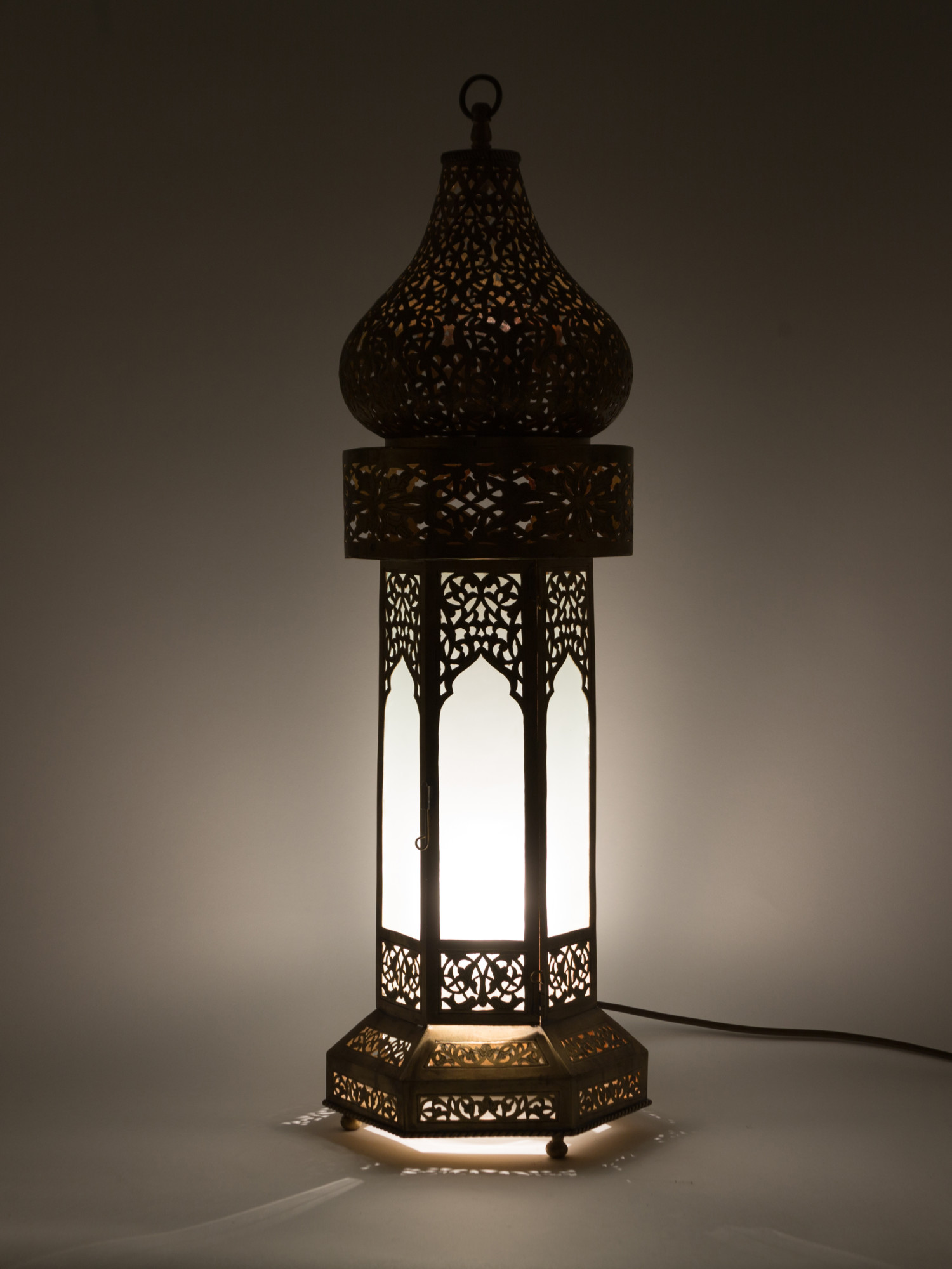 Living up to its name, which comes from the Arabic for ‘tower’, our Burj table lamp has a handsome architectural quality. Topped with a traditional dome, the main body of the lamp is lined with frosted glass panelling and adorned with hand-sawn ornamental arches. The illumination provided by its base-mounted light source is largely diffused through the frosted glass to create a calmly luminous effect.