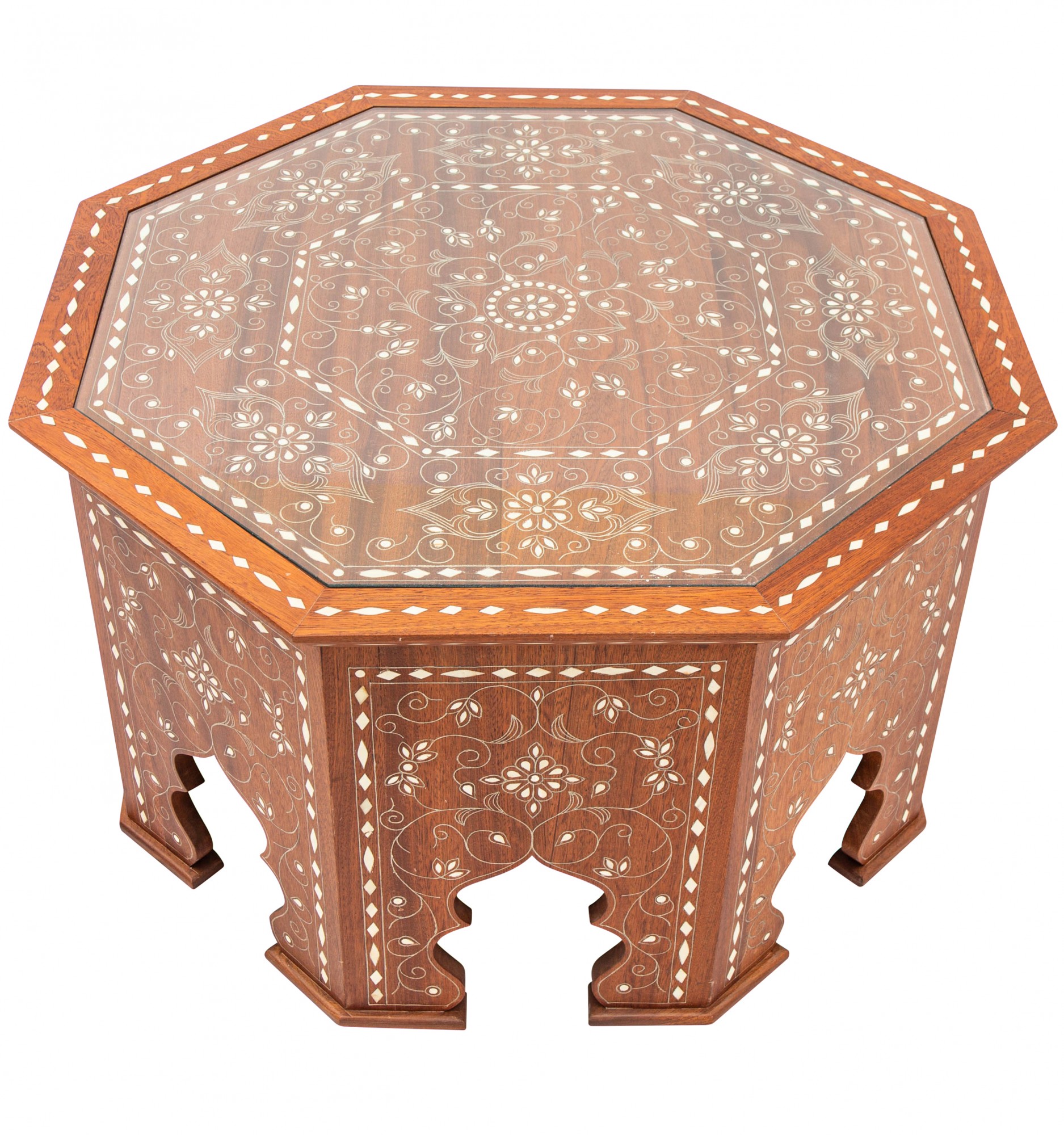 Made from mahogany and decoratively inlaid with bone, our Daris coffee table brings a freshness of tone to the rich depths of Arabic tradition. Topped with toughened glass, each of its eight side panels bears a carved central archway in classic Middle Eastern style.