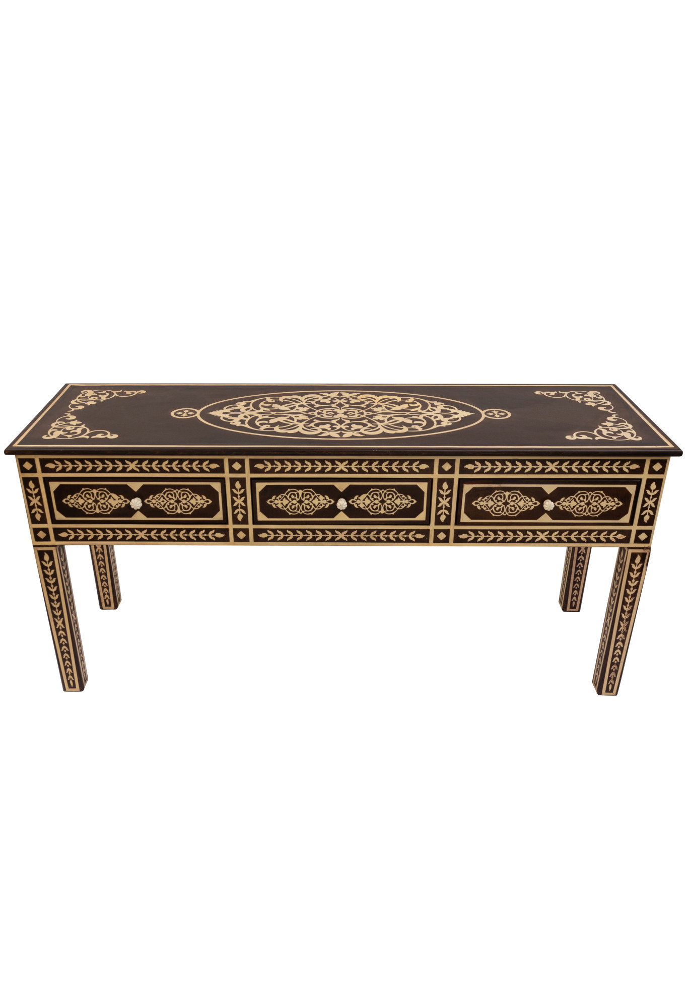 Our Kazem side table is characterised by the contrasting but complementary tones of its coffee and golden cream resin inlay, which is used to beautifully ornate effect on every surface. Fitted with three drawers, and blessed with a relaxed refinement, it is a piece designed to radiate a sense of poise and warmth.