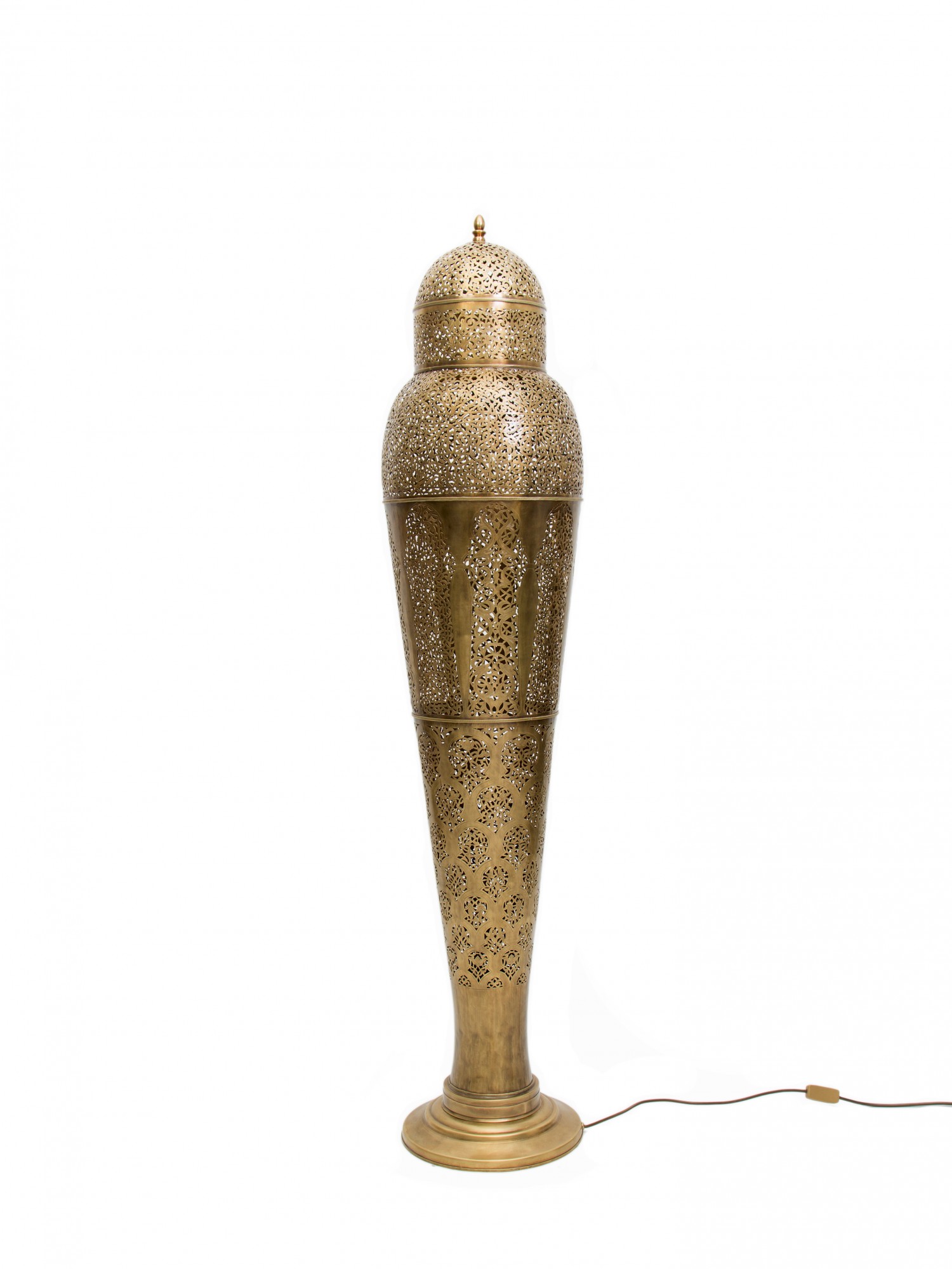 Designed to showcase the extraordinary talents of the maalem in our Marrakech brass atelier, our elegantly proportioned Mansour Standing Lamp features six separate sections – each one a blank canvas for a different pierced and hand-sawn motif. Together they transform this lamp into a work of art – fit to adorn the palace of a king, sultan or emperor. This is the medium-sized version of the lamp. Small and large versions are also available.